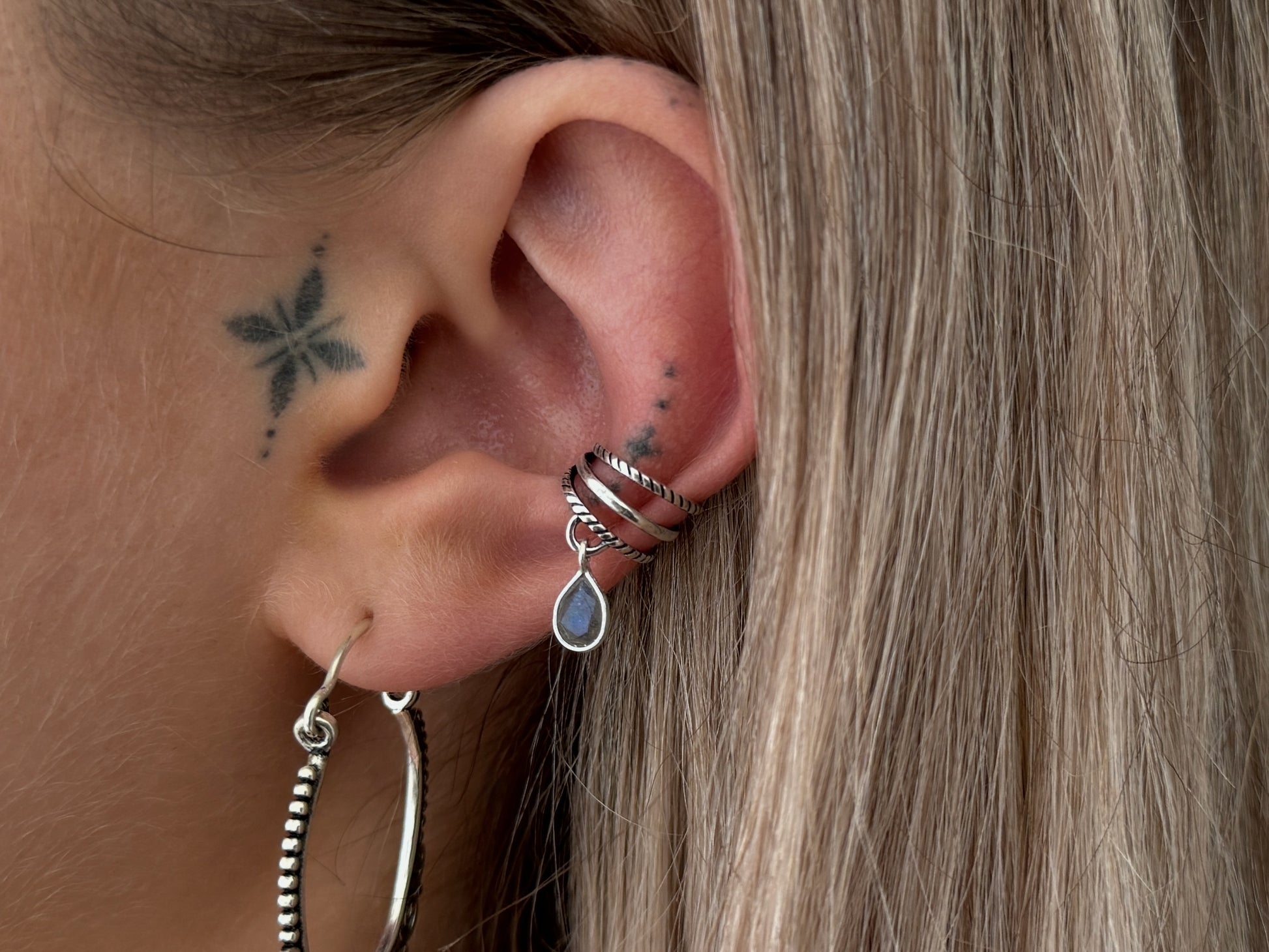 Die Creole auf dem Bild im unteren normalen Ohrloch ist nur ein Tragebeispiel. Diese ist nicht im Preis enthalten.