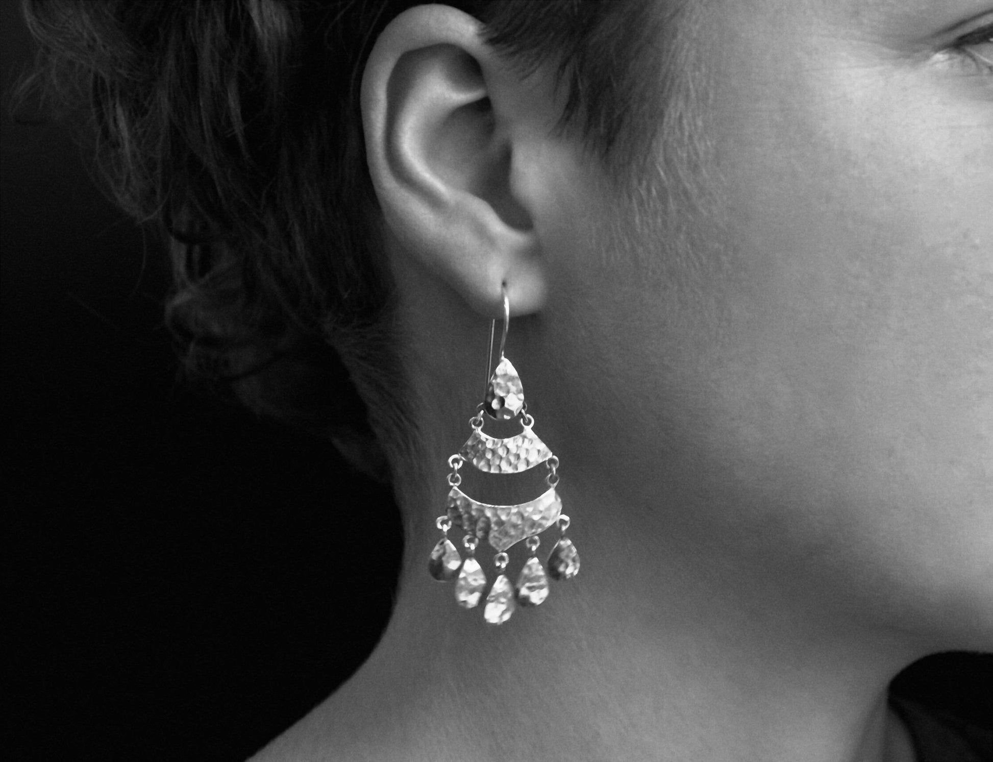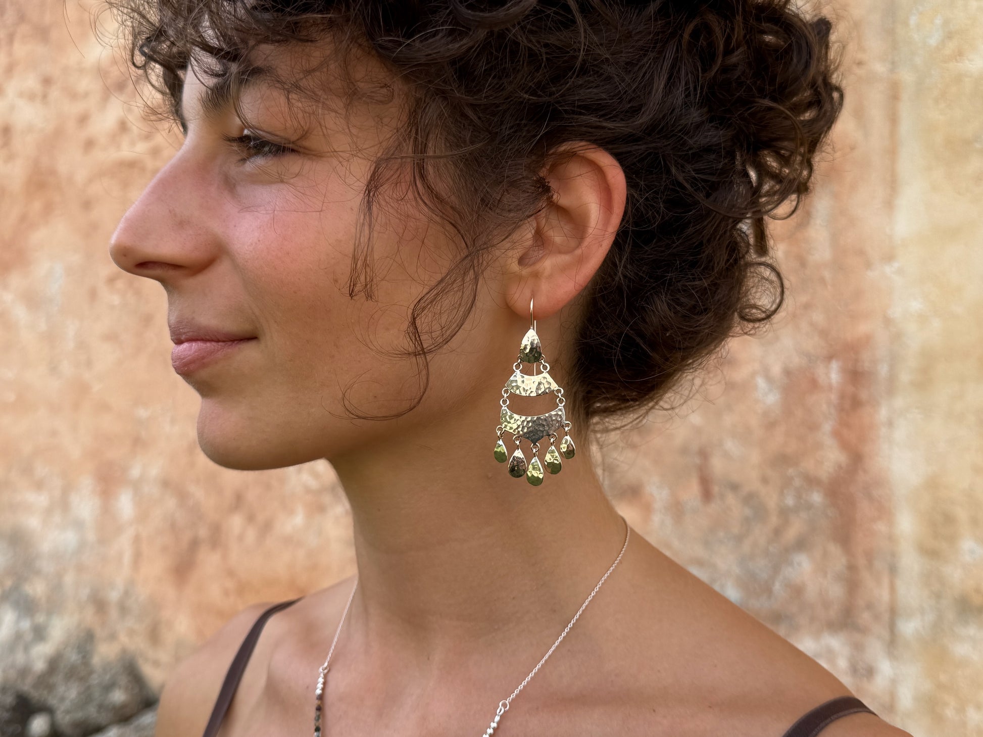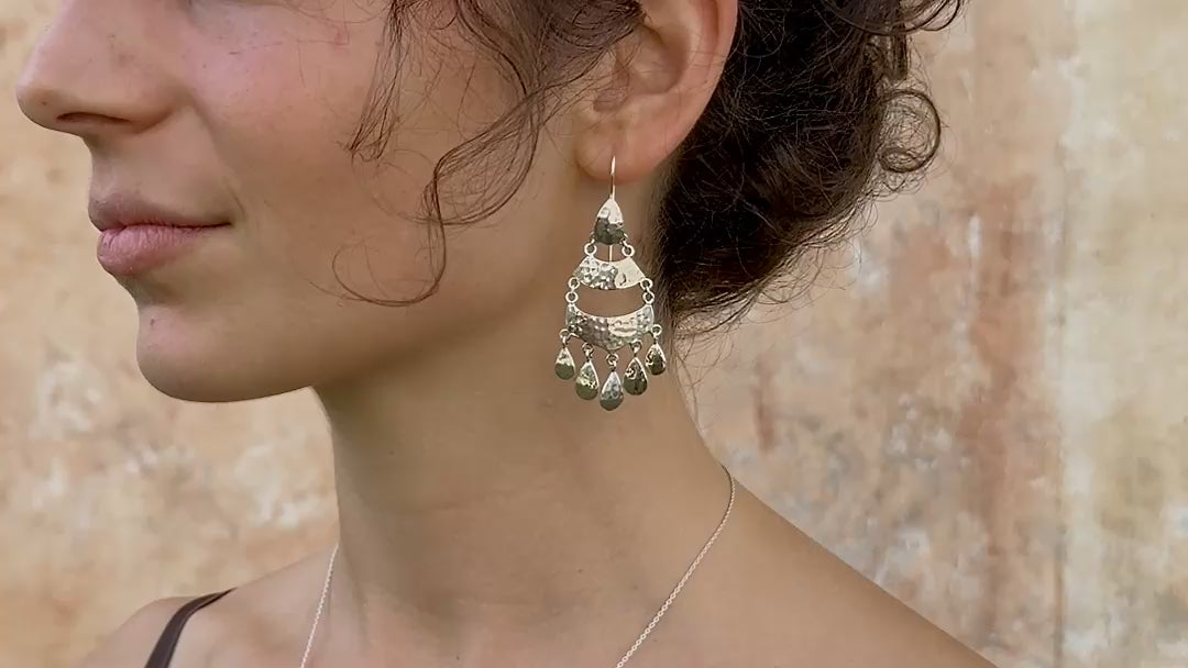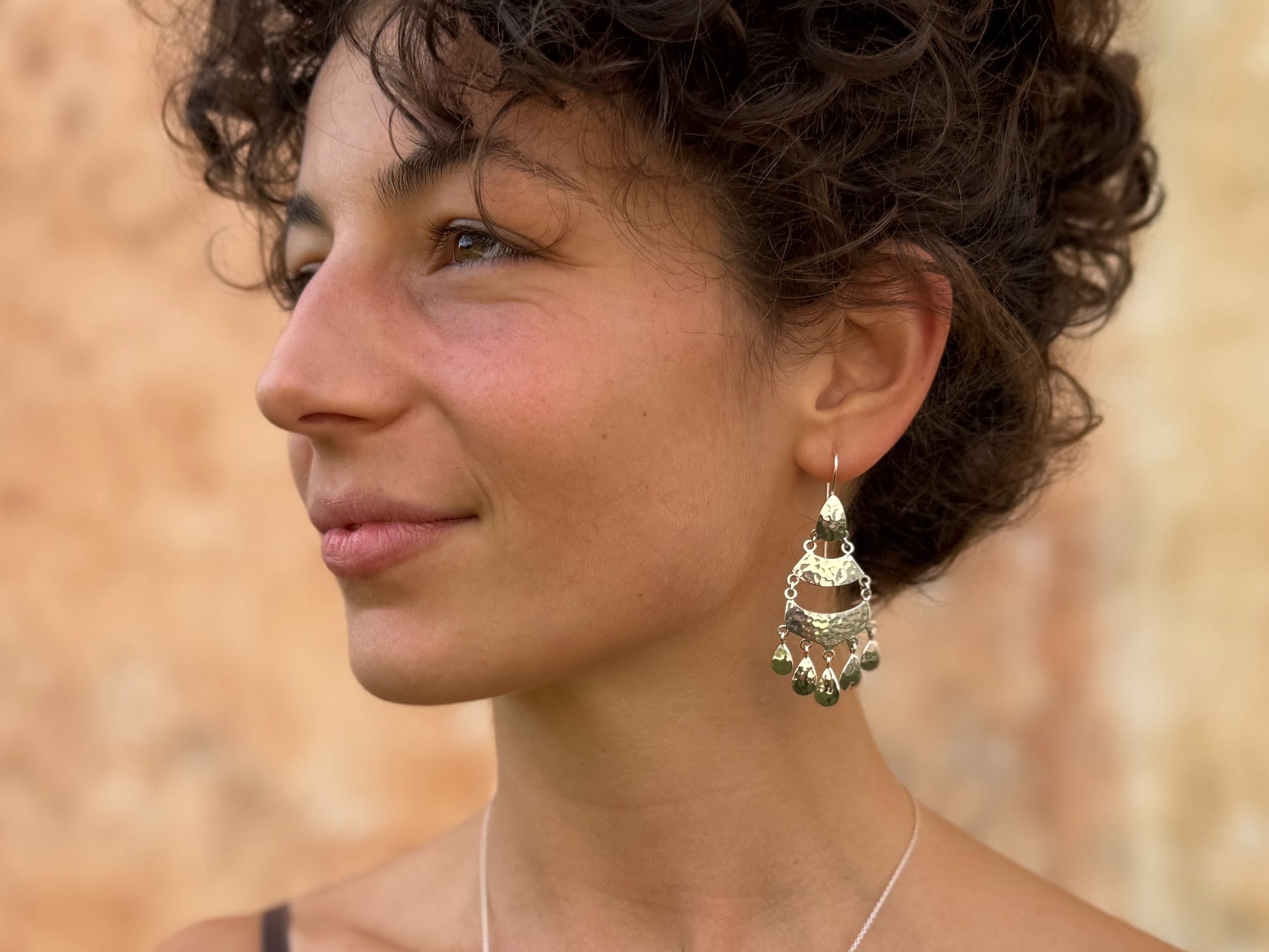 große Ohrringe mit baumelnden Elementen und Hammerschlag Optik aus Silber