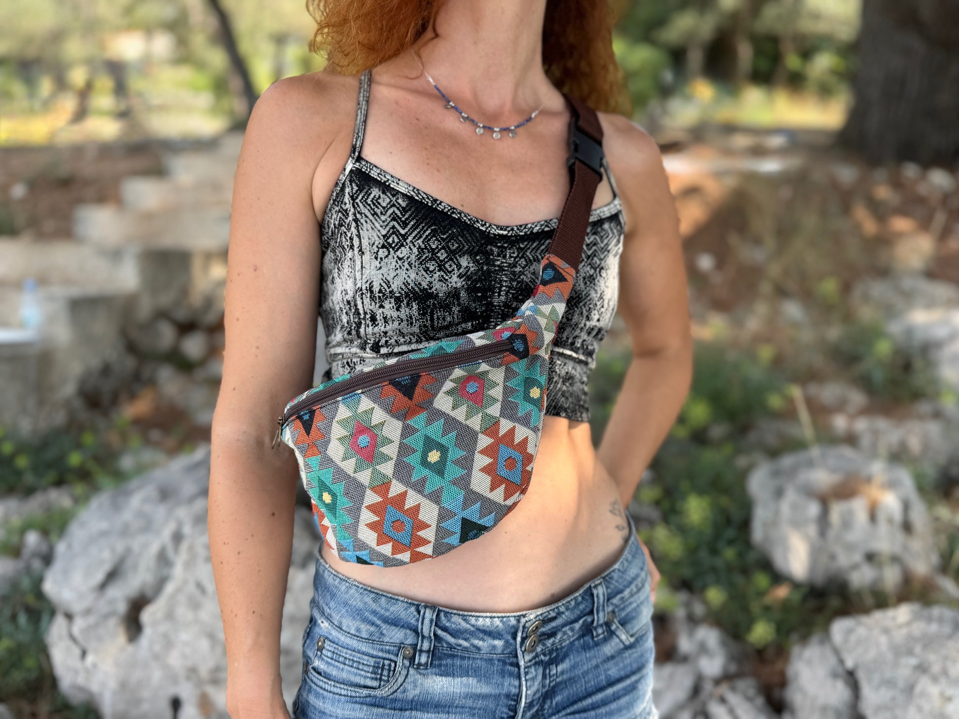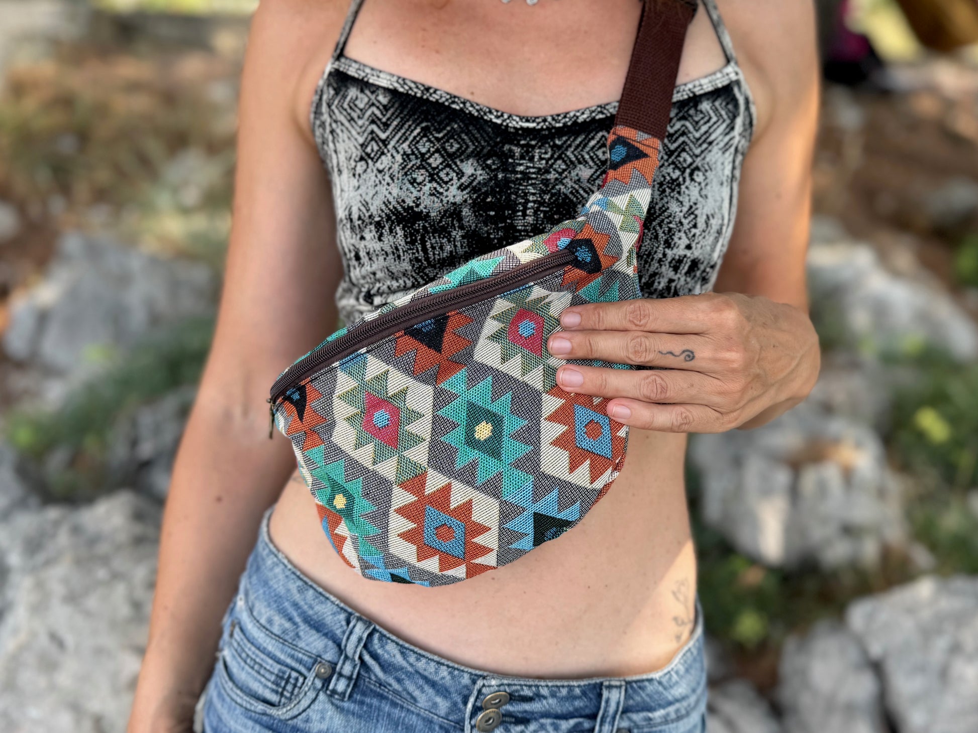Diese stylische Bauchtasche mit geometrischem Muster ist der ideale Begleiter für Alltag, Reisen, Festival oder Spaziergang. Sie lässt sich klassisch um die Hüfte tragen oder lässig als Crossbody-Tasche über die Schulter hängen – genau so, wie es gerade am besten passt.