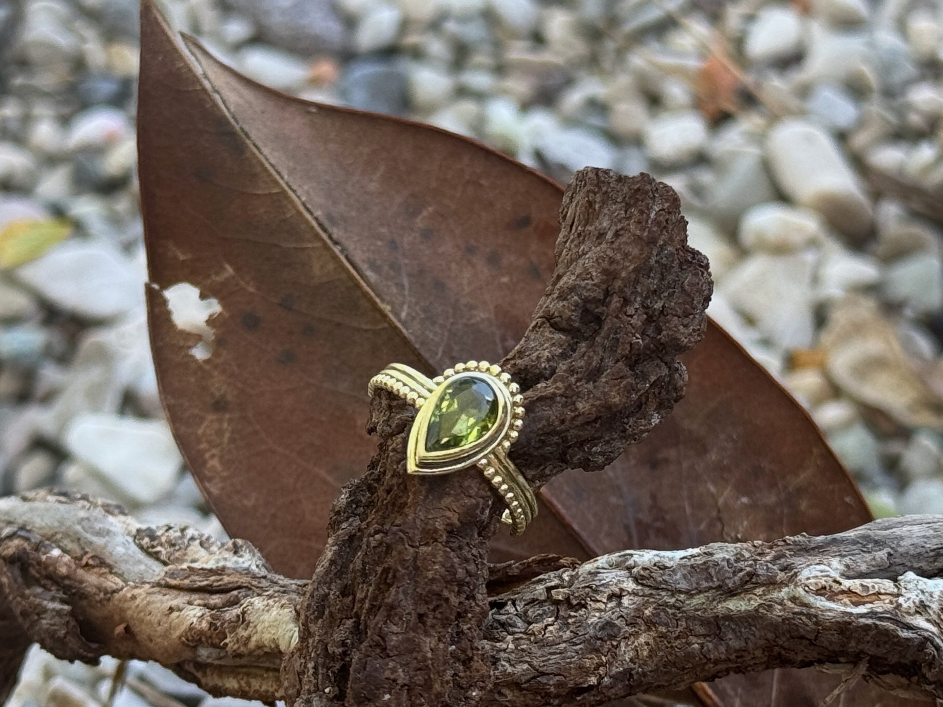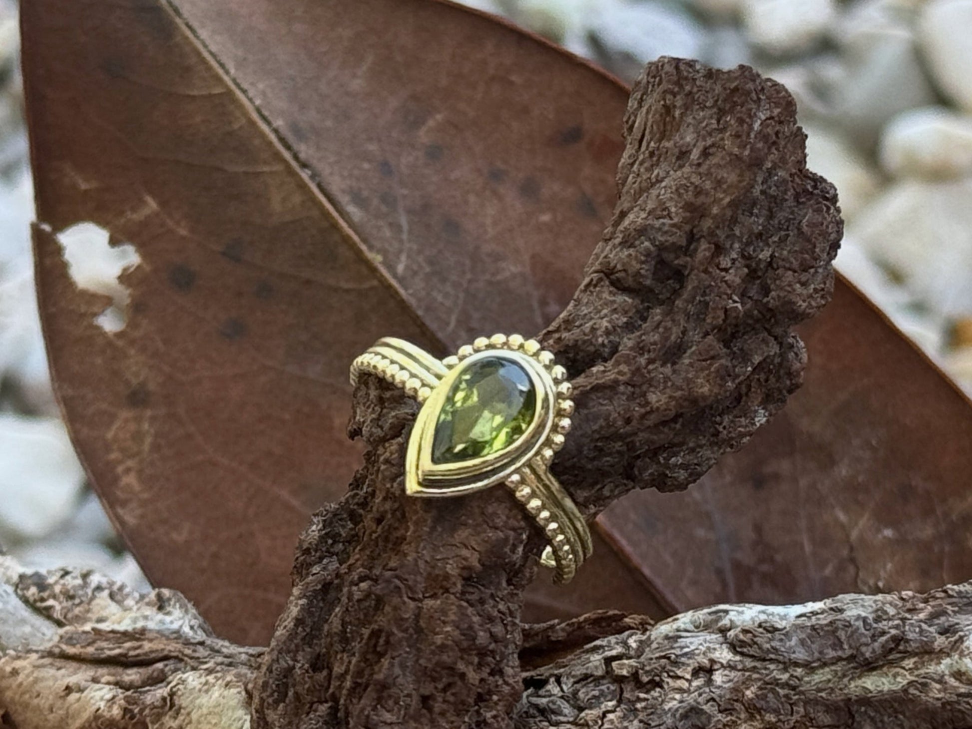Schlicht und ausdrucksstark zugleich: Dieser Ring aus Messing setzt mit dem facettierten Peridot in Tropfenform einen dezenten Farbakzent. Die fein gearbeitete Fassung mit Perlrand unterstreicht das natürliche Funkeln des Edelsteins.