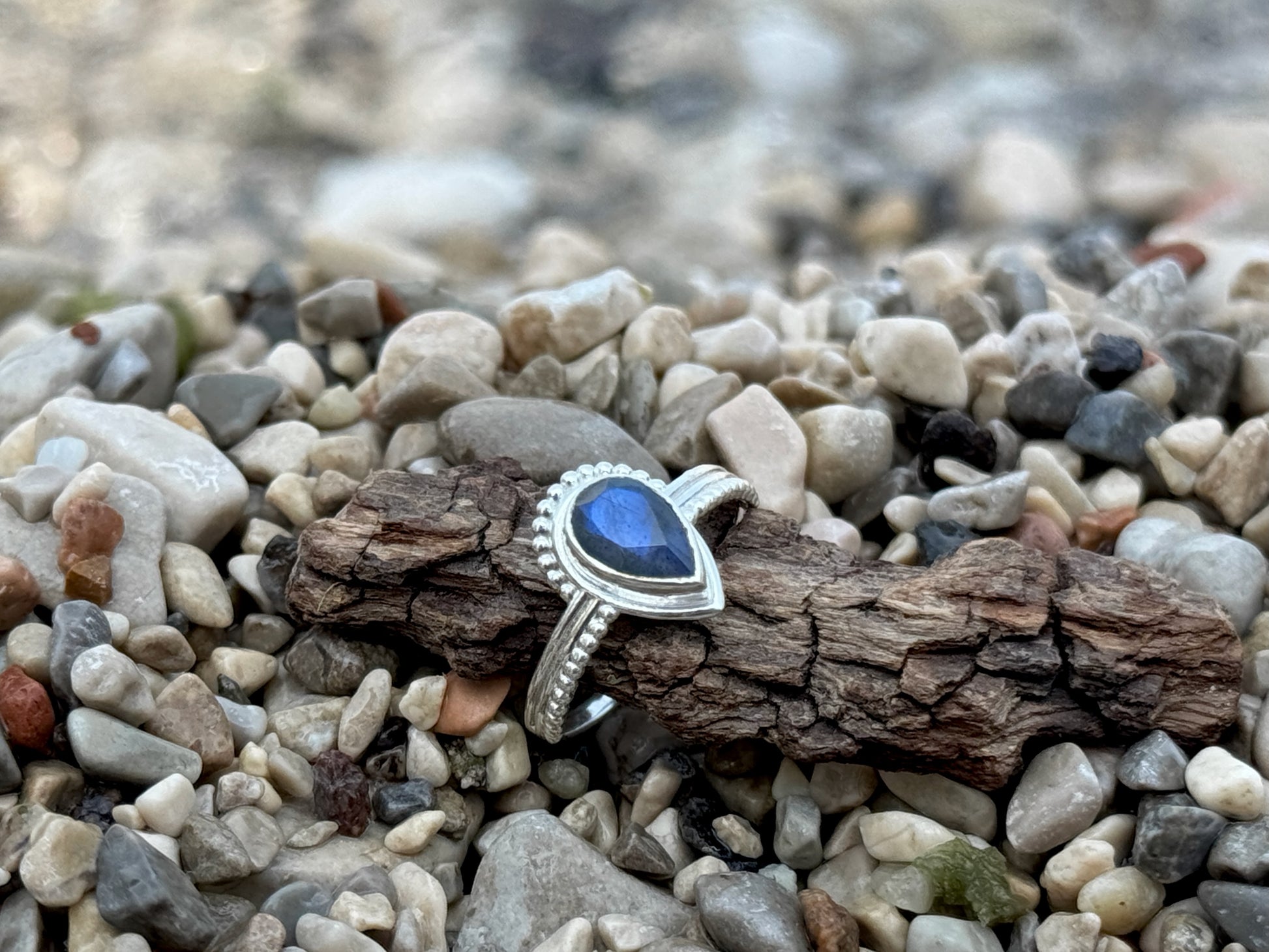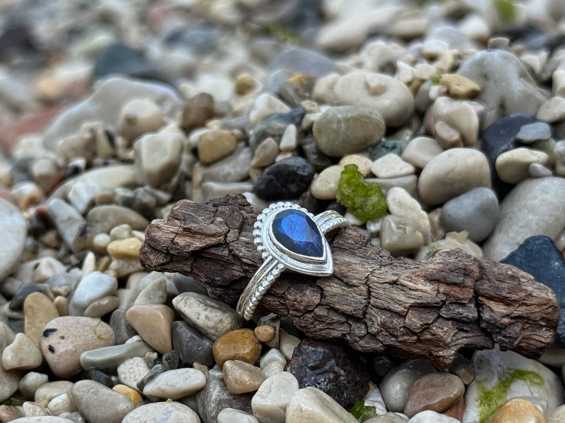 Tropfenförmiger Ring aus 925 Sterlingsilber, gefasst mit einem facettierten Labradorit Stein. Teilweise verziert mit kleinen Silberkügelchen, welche dem Design eine feine, verspielte Note verleihen. Je nach Lichteinfall zeigt der Stein sein typisches, schimmerndes Farbspiel. Jeder Stein ist ein Unikat und kann somit leicht von Farbe und Form abweichen