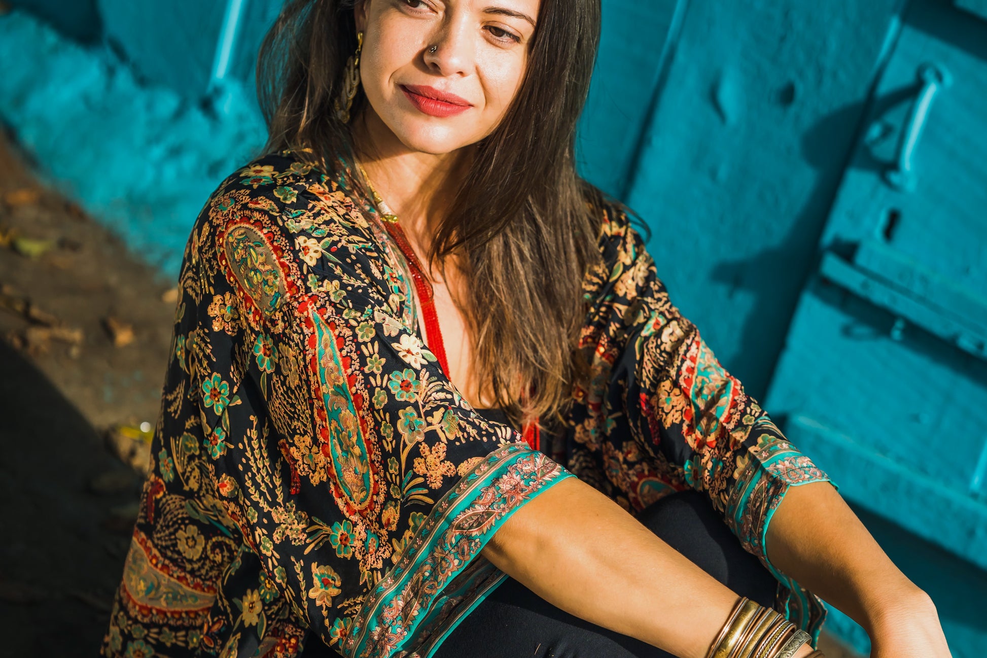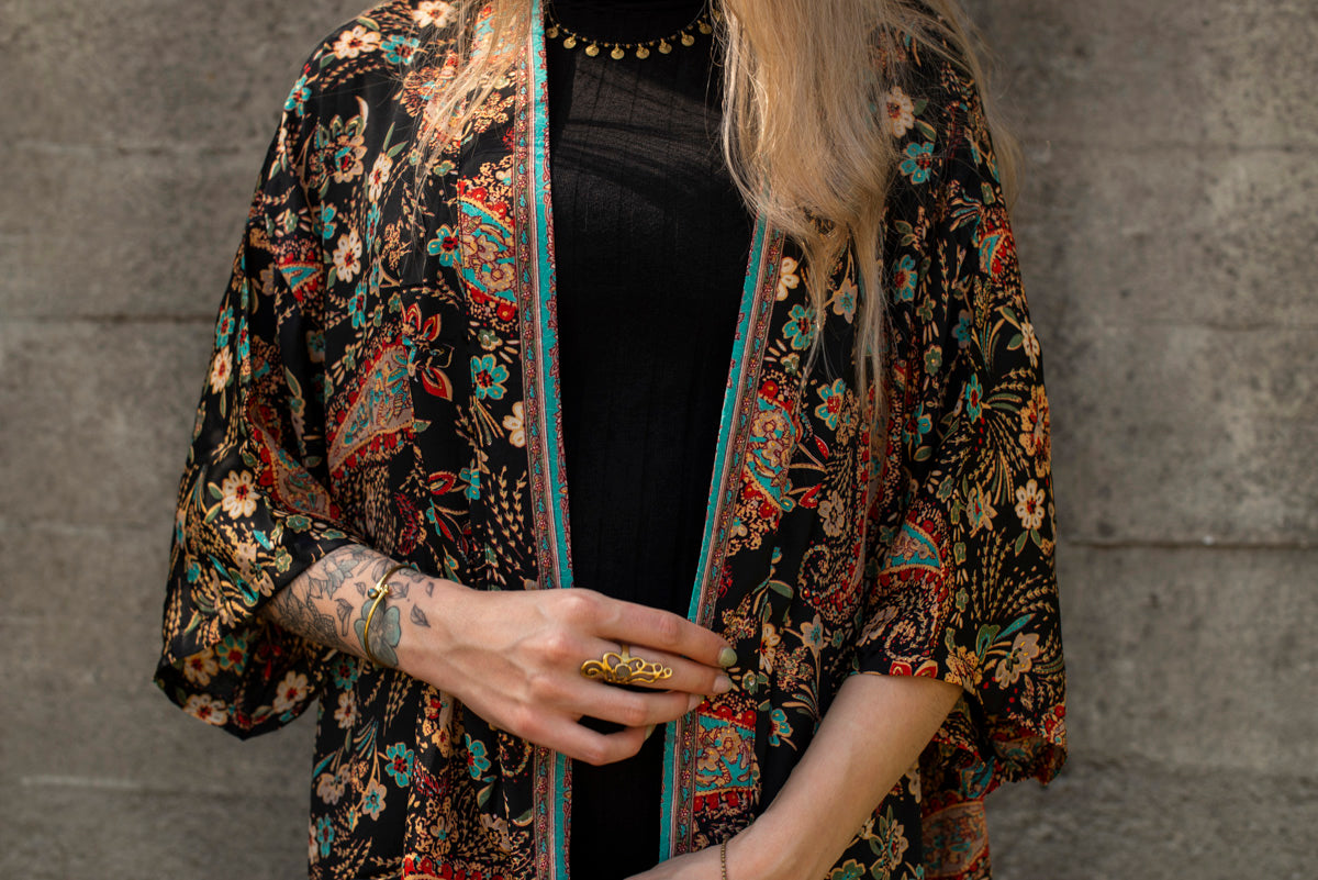 schwarz bunt gemusterter Kimono, Bluse, Überwurf, leichte Jacke