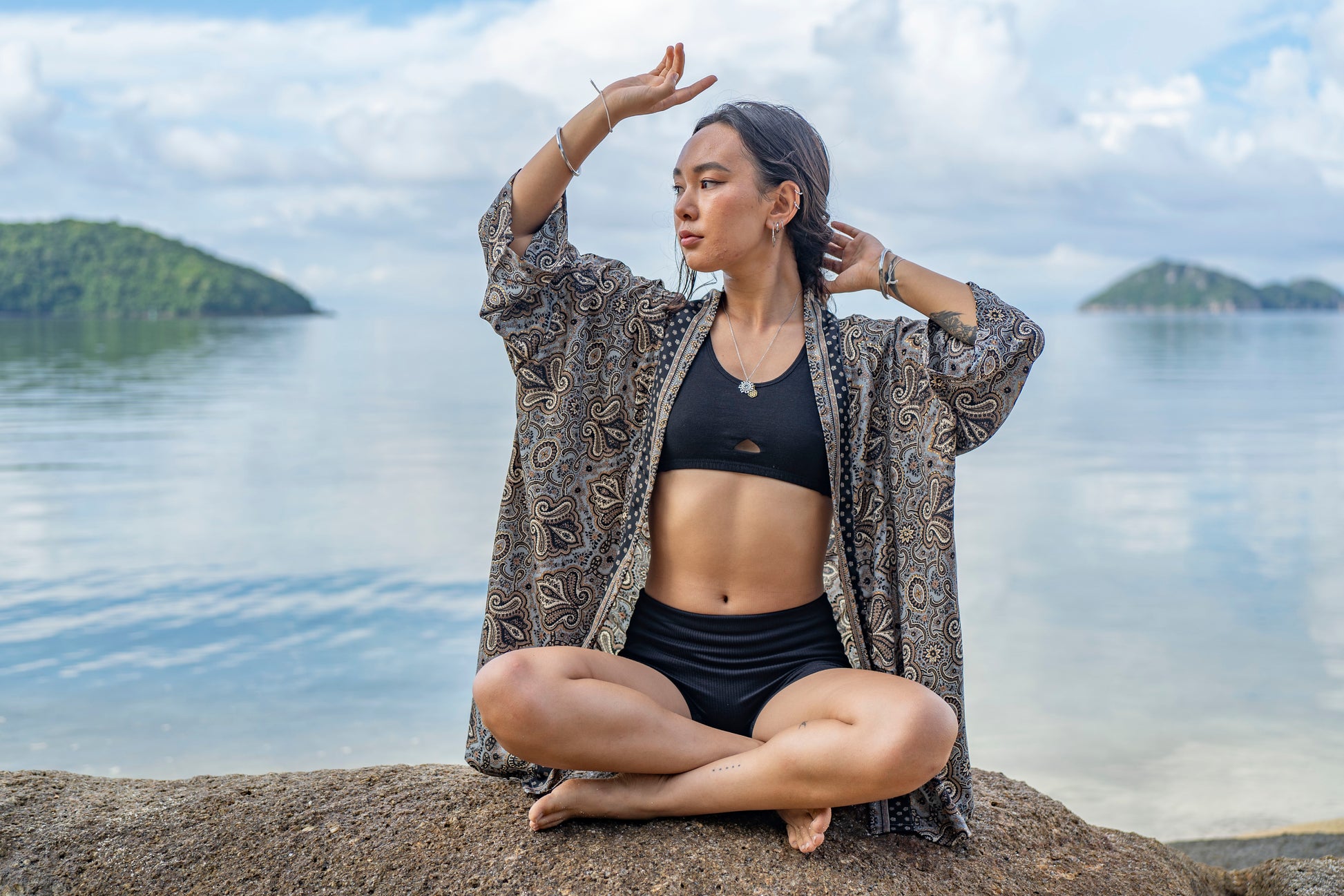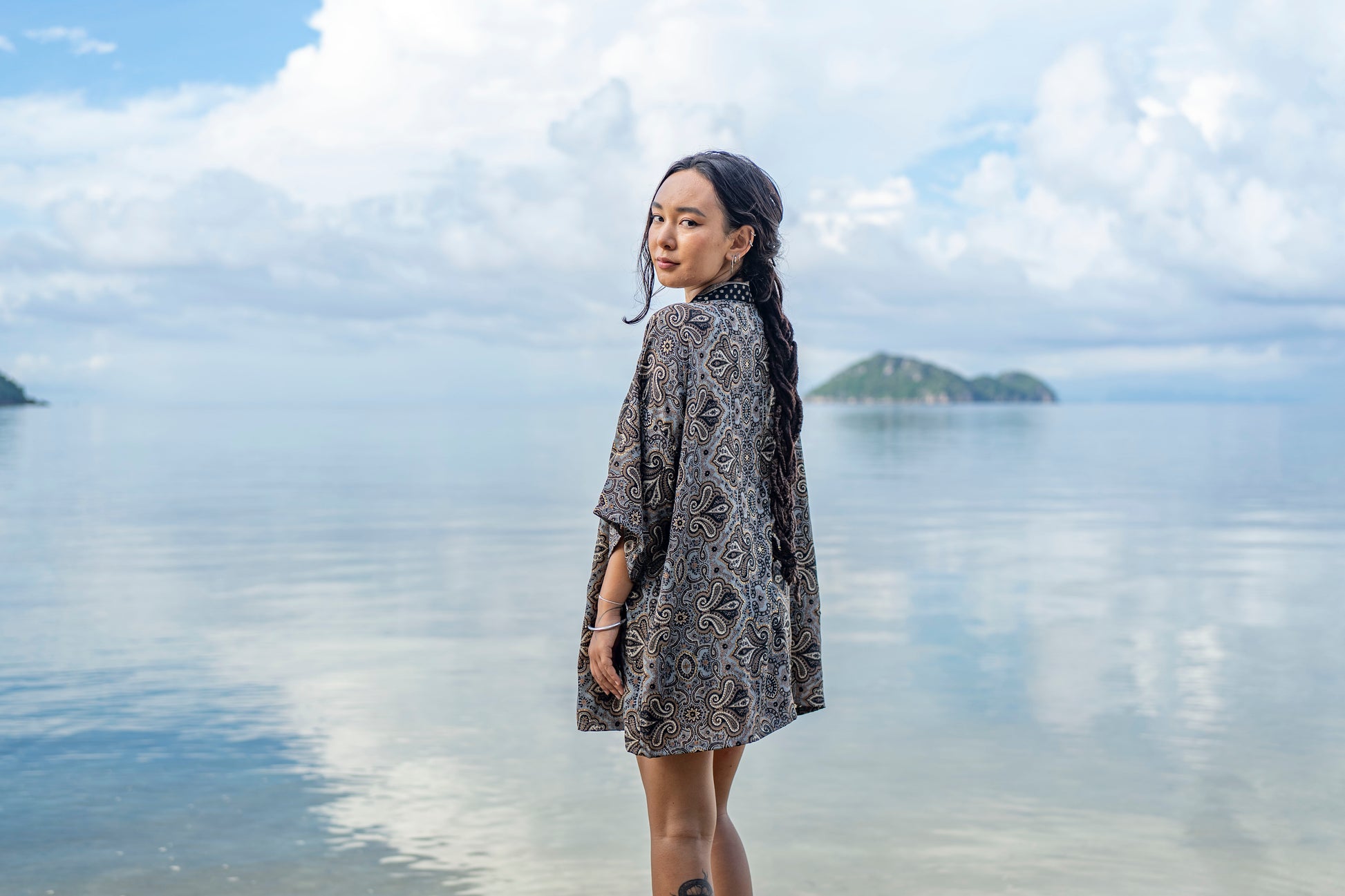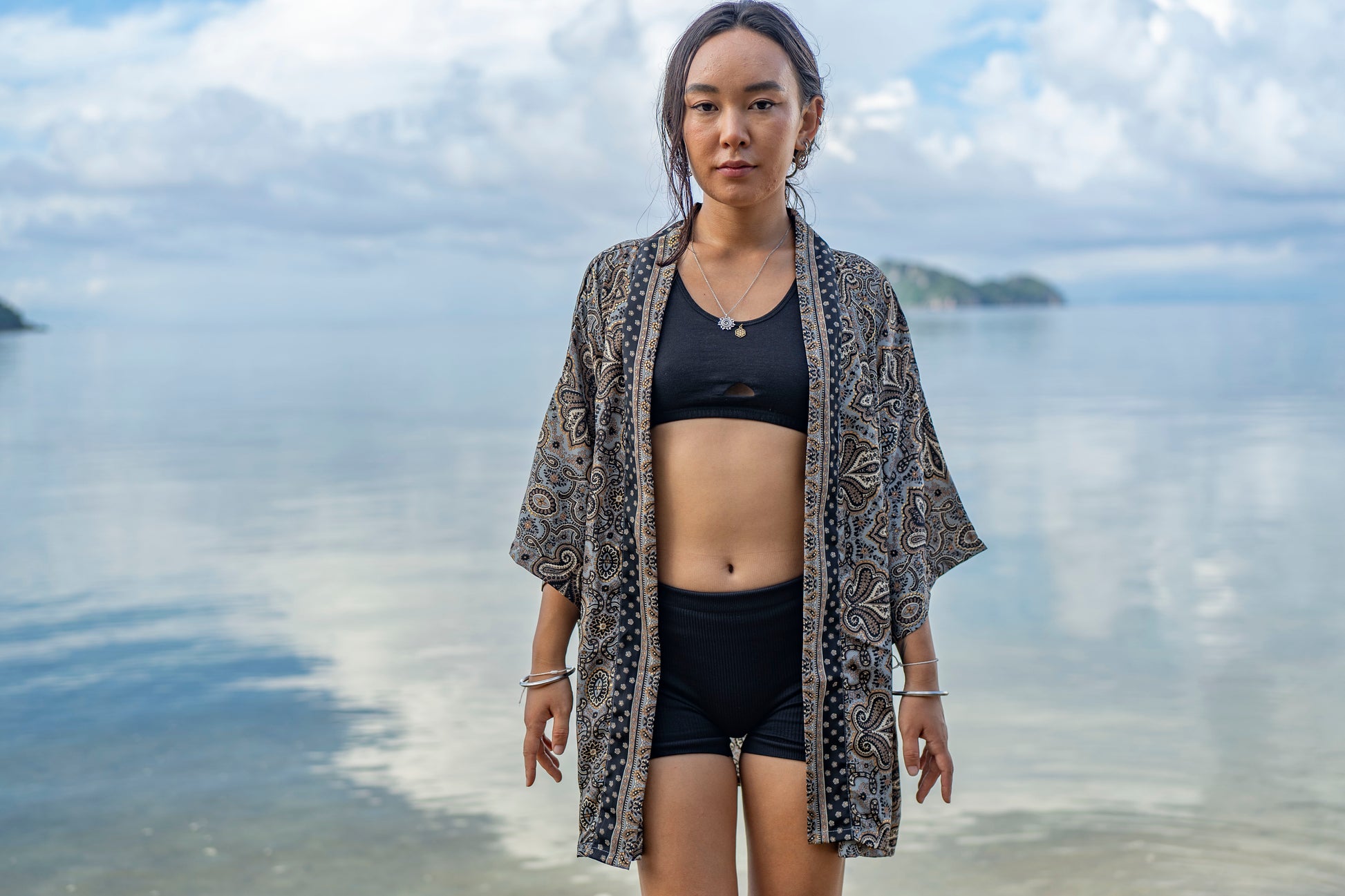 schwarz grau beige gold gemusterter Kimono, Bluse, Überwurf, leichte Jacke