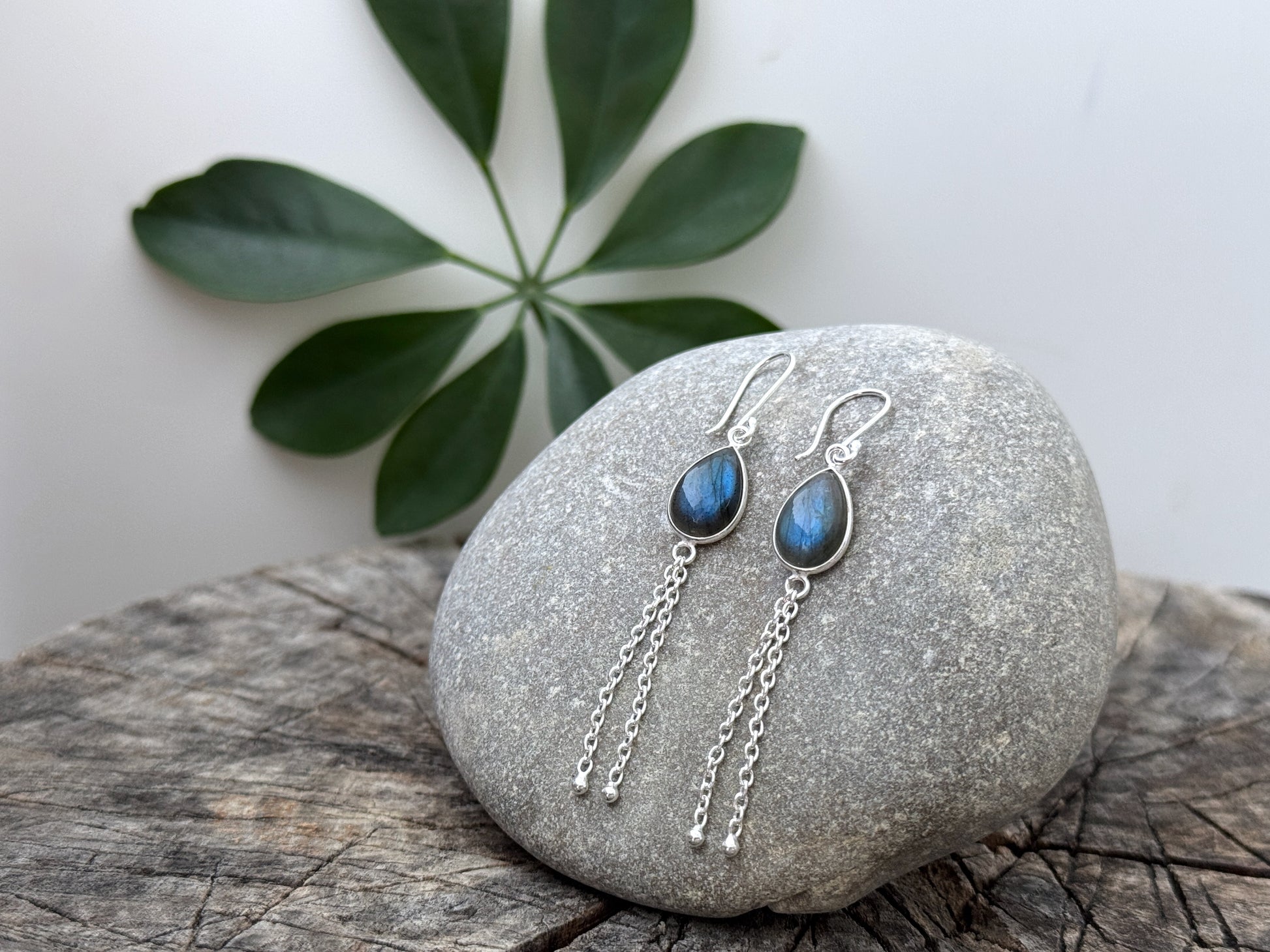 tropfenförmige Ohrringe mit blau schimmerndem Labradorit Stein und baumelnden Kettchen