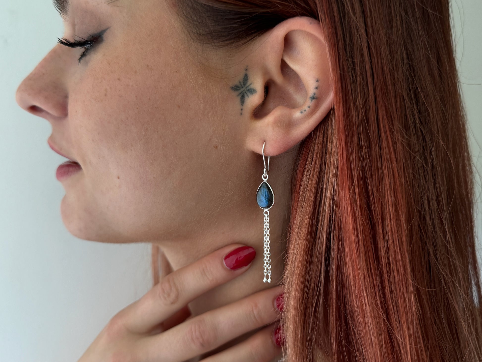 tropfenförmige Ohrringe mit Labradorit Stein und baumelnden Kettchen aus Silber