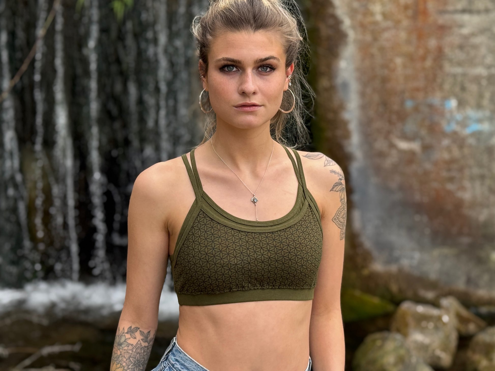 Yoga Top mit detailliertem Rückenmuster, bedruckt mit dem Muster der Lebensblume, olive grün