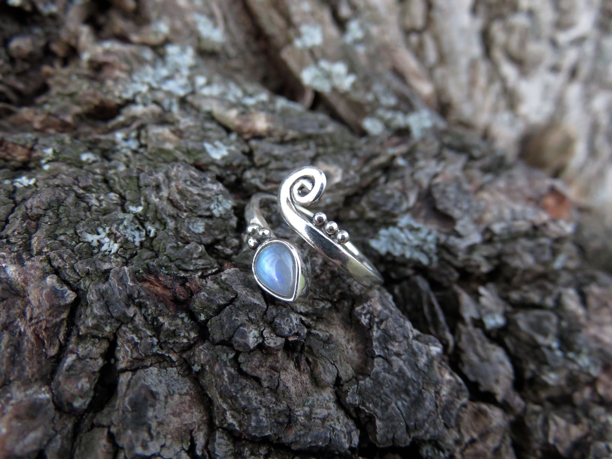 Eleganter verstellbarer Silberring mit Stein in Tropfenform.